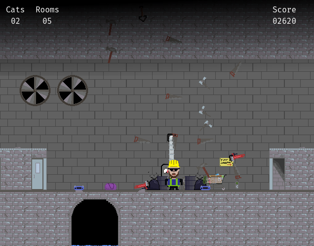 Cats may fall from above. Cats can be caught by entering and remaining in the catch stance (space bar or center touch button). A caught cat will hop into the player's backpack and provide a score bonus on exiting the stage. Cats which are not caught will run away. Cats can only spawn once the door opens.