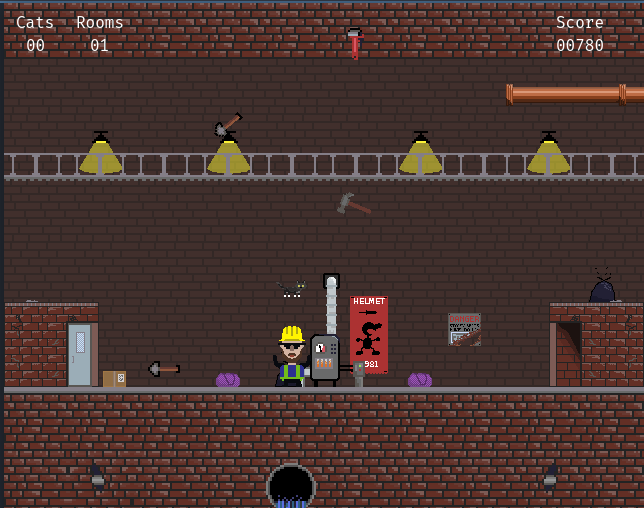 Cats may fall from above. Cats can be caught by entering and remaining in the catch stance (space bar or center touch button). A caught cat will hop into the player's backpack and provide a score bonus on exiting the stage. Cats which are not caught will run away. Cats can only spawn once the door opens.